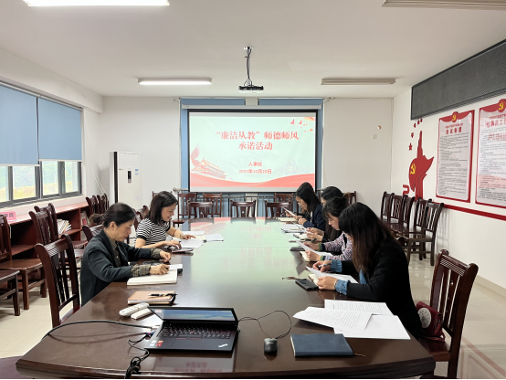 赵田英书记传达了自治区党委教育工委、自治区教育厅《大力推进广西清廉学校建设实施方案》及《关于扎实推进清廉学校建设的十条措施》精神,指导支部党员结合工作岗位特点,认真查找存在的廉洁风险点,与全体党员同志签订了《人事处教师廉洁从教承诺书》,鼓励全体党员同志以“廉洁从教、服务教职工”为切入点,认真履行岗位职责,严格遵守教育规定、职业道德规范、职业纪律。支部共10位教师签订了廉洁从教承诺书。