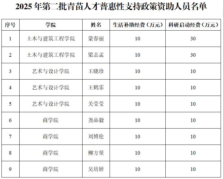 近日,自治区公布了第二批青苗人才普惠性支持政策资助人选,学校土木与建筑工程学院、艺术与设计学院、商学院的蒙春丽、梁志孟、王晓珍、王鹤霏、关莹莹、尧品毅、刘博伦、柳方堃、吴培妍等9名青年博士获得资助,共获生活补助90万元,科研启动经费130万元。
